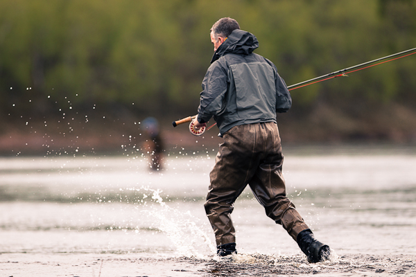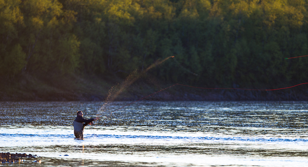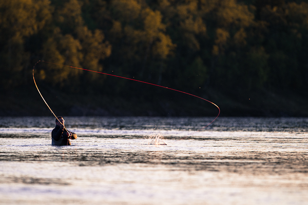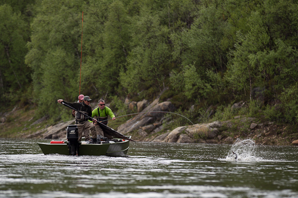We also discussed the use of boats on Ponoi and the misconception that you have to fish from a boat. Boats are used for several reasons on the Ponoi. First to access the beats which are spread over 70 kms. Second, to move rods from wading spot to wading spot, to walk would be a huge waste of time. Third, to fish from should guests wish for any reason. For some it simply allows them to continue to be able to fish for salmon, for others it is fun or they prefer not to wade etc. They are also equipment movers and containers. They carry first aid kits, change of clothes, wood for fires and cooking, guests camera bags, videos, medication, tackle bags etc etc. They are used to reach lies that wading cannot reach but they are also used tactically to vary angle and create fly speed swinging the fly away from the bank at increasing speed as opposed to into the bank at decreasing speed. These pictures explain this well – the rod is casting to the bank and the fly is pulling away from the fish at increasing speed which induces the take. He has a unique way of celebrating!